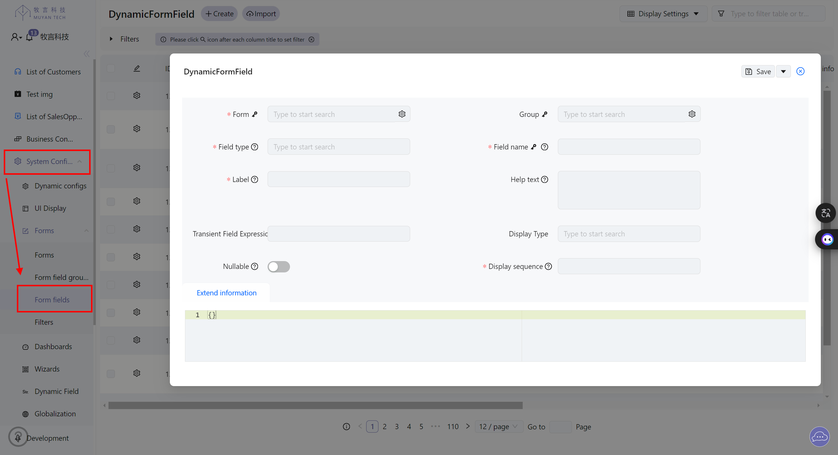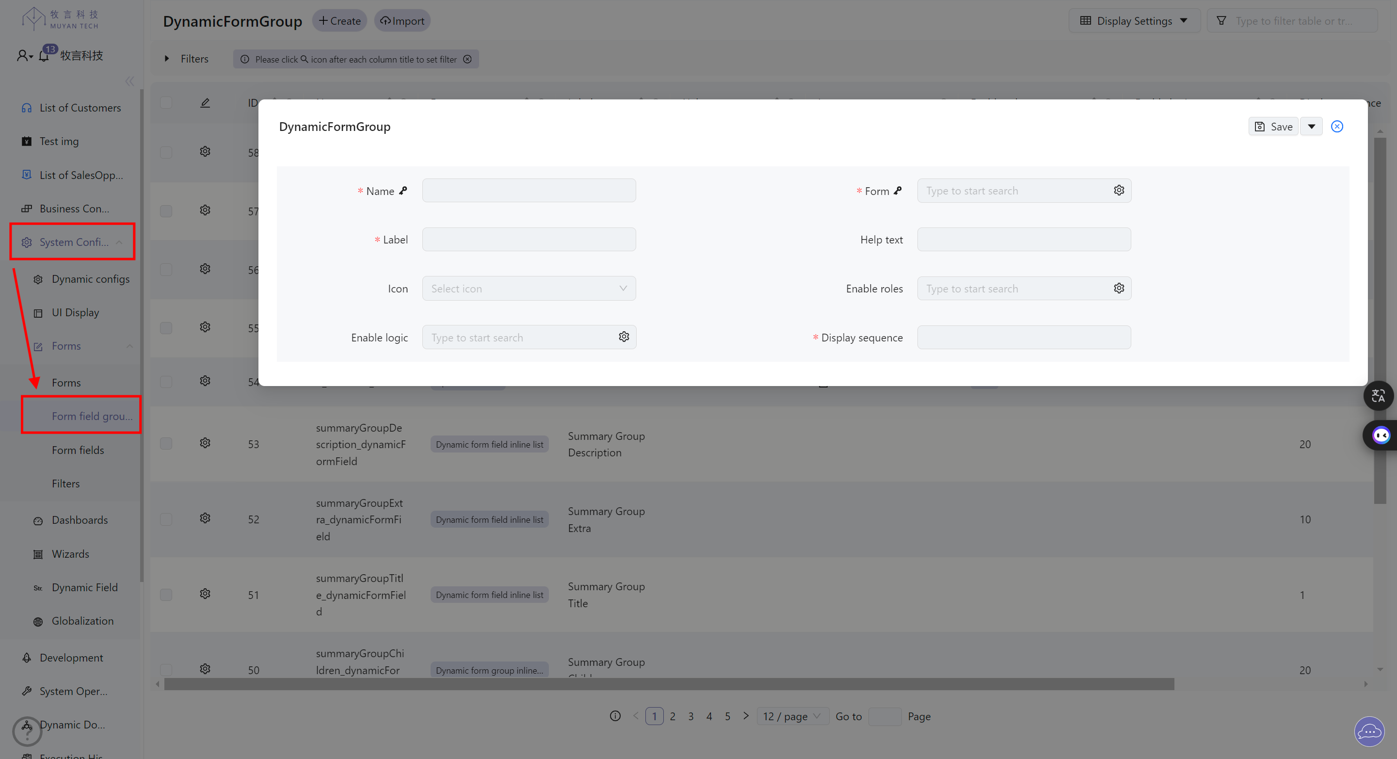 自定义表单字段分组保存在系统的 Dynamic Form Group 对象中,在界面上,可通过菜单