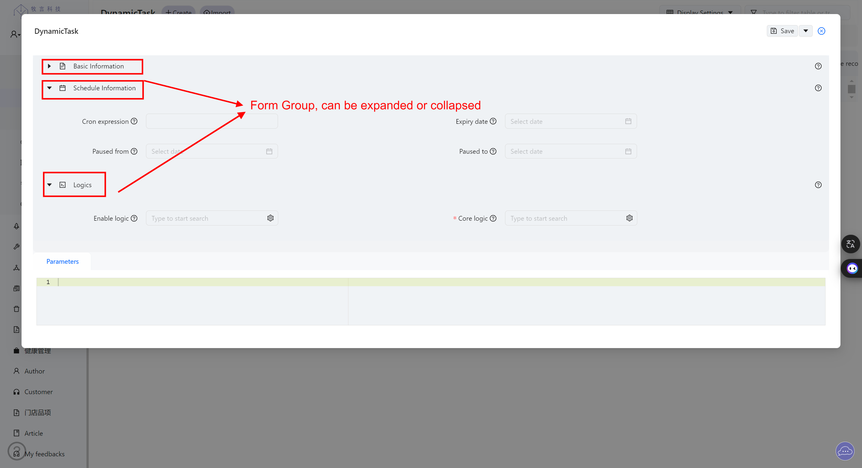 表单字段在对象的创建和编辑界面上,可以可折叠的字段分组进行展示,且系统支持在字段 组的级别,使用动态逻辑自定义该字段组是否显示。关于动态逻辑的详情可参考 动态逻辑 章节。
