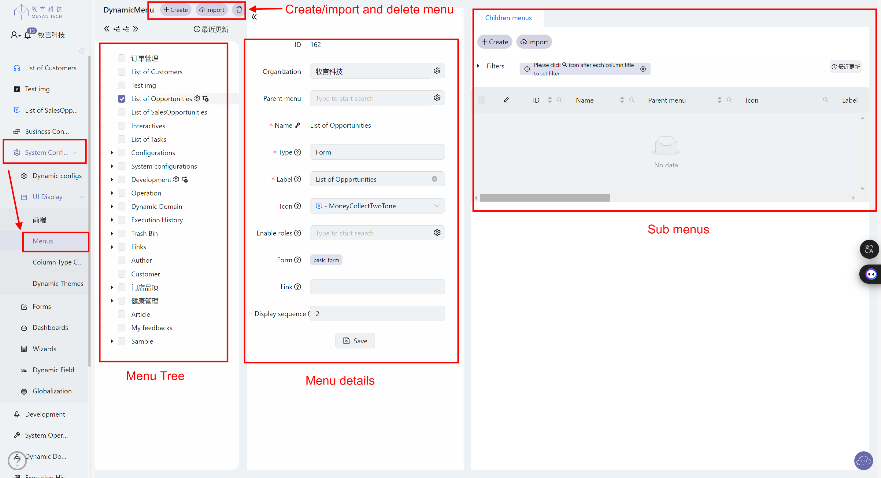 本系统的所有界面显示菜单均通过保存在系统数据库中的 Dynamic Menu 对象进行渲染,在界面上,可