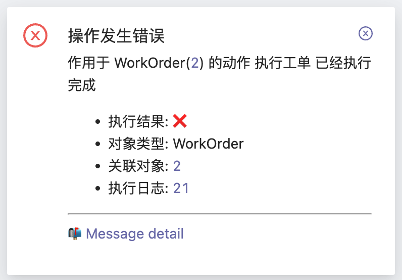 如果在上一个自动执行任务还未结束就重复执行同一个工单那么会出现错误,错误内容如下
